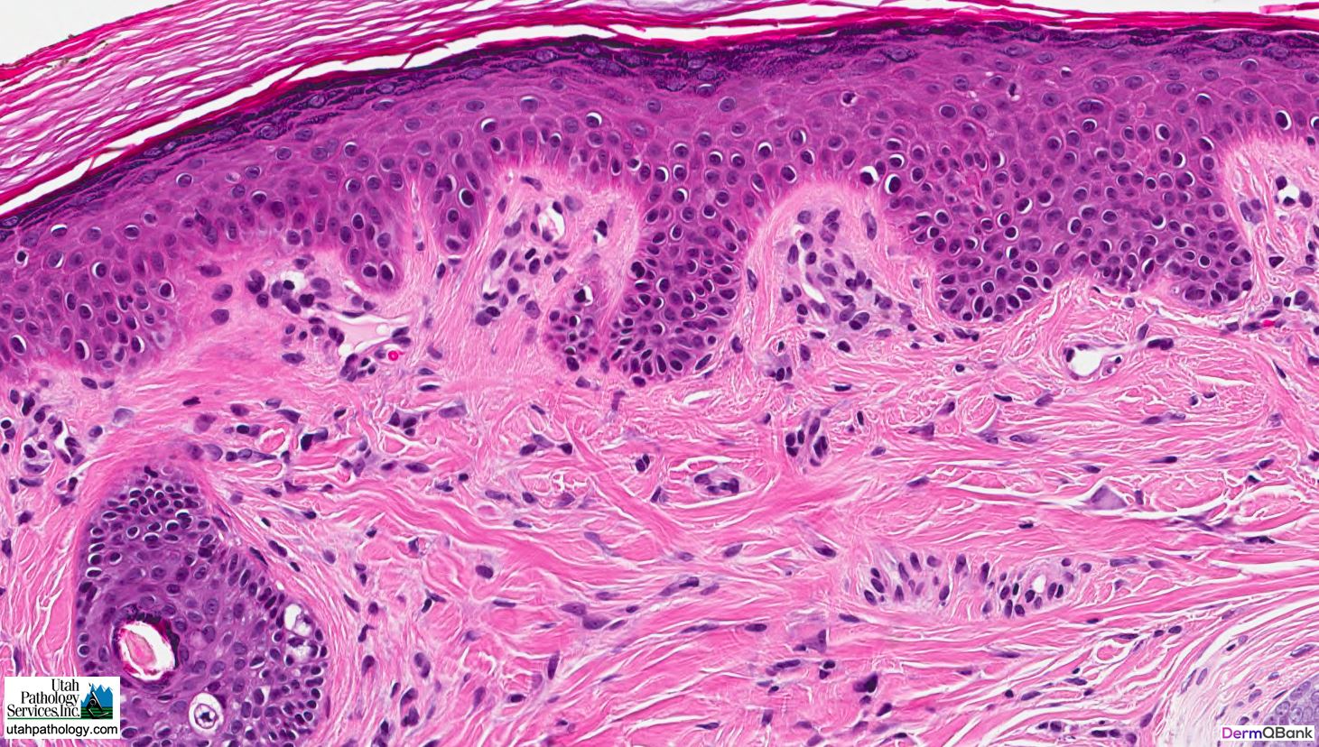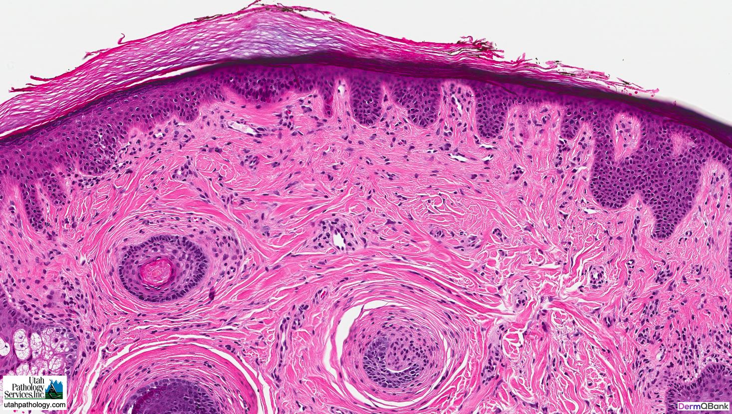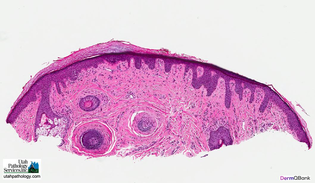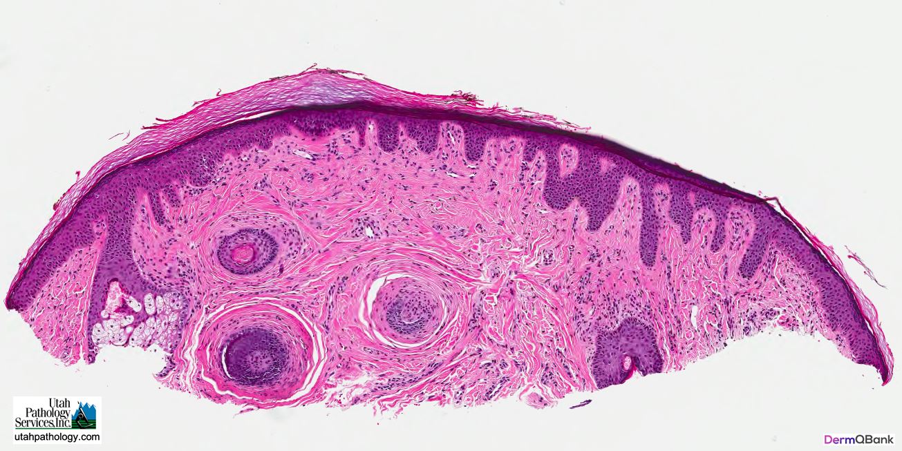 Pathology shows a dome-shaped lesion with a dermal proliferation of plump or stellate fibroblasts (some may be multinucleated) in a collagenous stroma with an increased number of dilated and thin-walled vessels. Collagen fibers may be arranged concentrically around these vessels and hair follicles. There are fewer elastic fibers.
